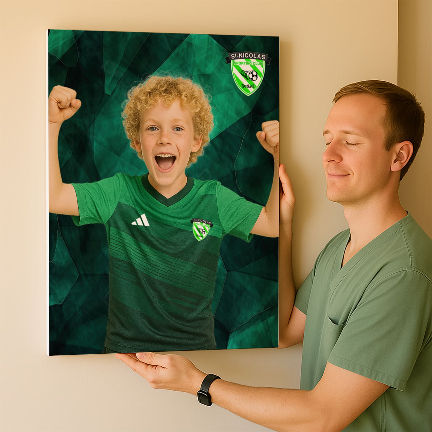 C'est très simple, choisissez votre club, cliquez sur le bouton "Personnaliser", et téléchargez la photo de votre enfant, qui sera automatiquement détourée pour s'insérer dans le fond de la toile !